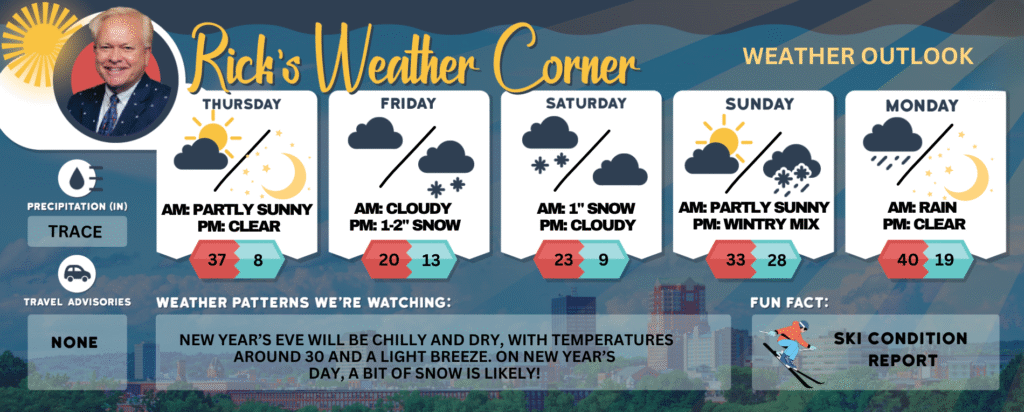 New Year’s Eve will be chilly and dry, with temperatures around 30 and a light breeze. On New Year’s Day, a bit of snow is likely!